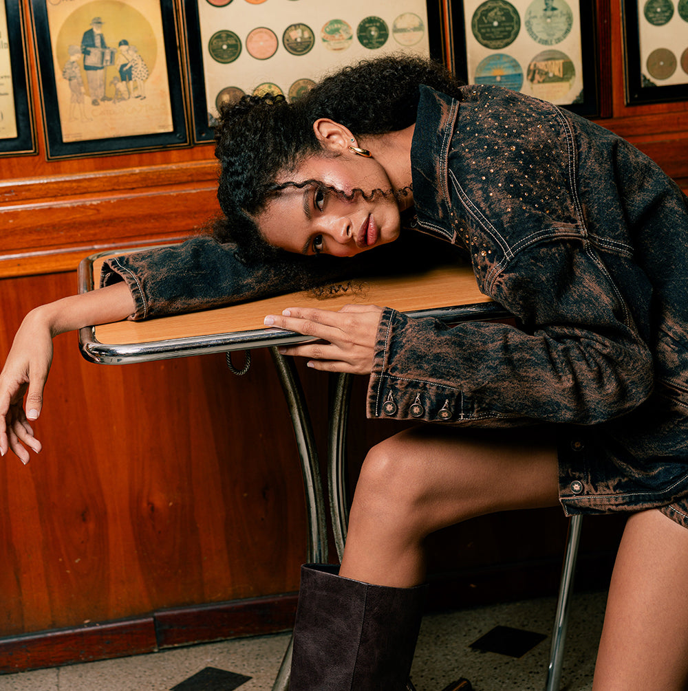 Chaqueta en denim con brillantes en el frente y en la parte trasera. Tela: 100% algodón. Ideal para usarlo como conjunto con la Falda Agüita Panela. La modelo mide 1.73 m y está usando talla S.