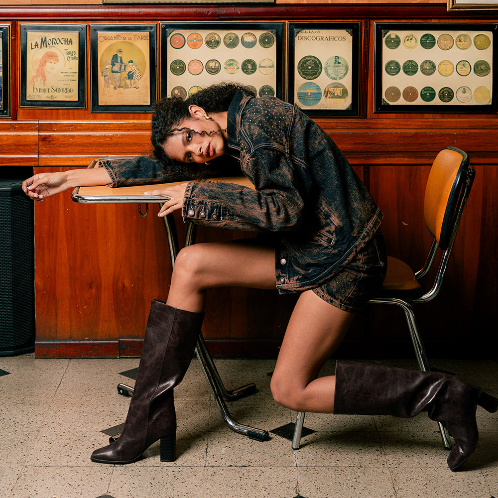 Falda tiro medio en denim con brillantes en el frente (Si te gusta usarlo descaderado pide una talla más grande de la que normalmente usas). Tela: 100% algodón. Ideal para usarlo como conjunto con la Chaqueta Agüita Panela. La modelo mide 1.73 m y está usando talla 4.