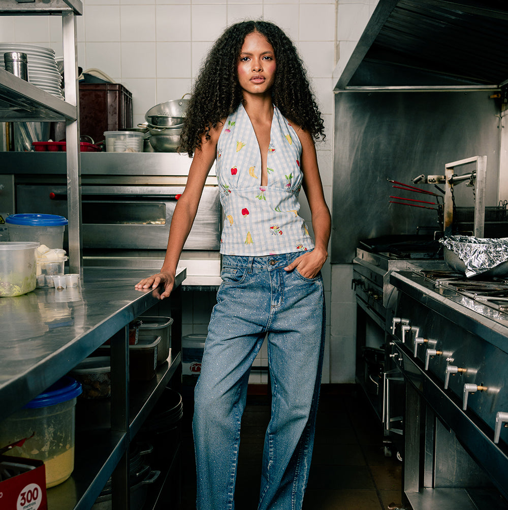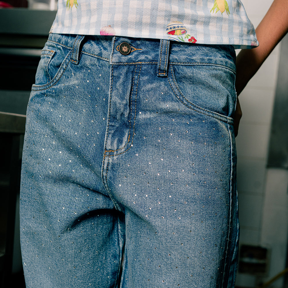 Jean azul oscuro, estilo barrel tiro medio (si lo quieres usar tiro bajo pide una talla más grande de la que normalmente usas). Tiene piedritas brillantes en el frente y estampados en los bolsillos traseros. Hecho en tela 100% algodón. Entrega en 8 días hábiles