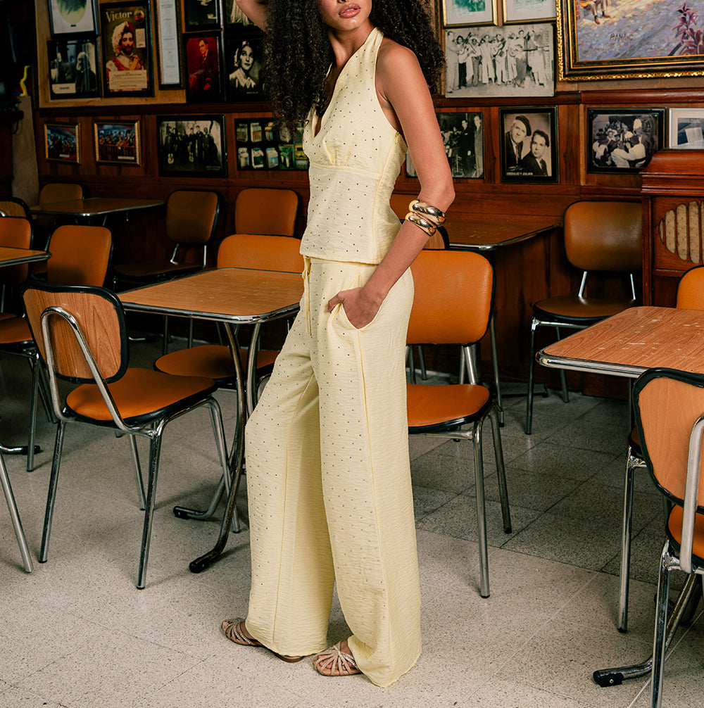 Pantalón butter yellow con piedritas brillantes. Tela: Rayón, es muy suave y fresca y no se arruga. Tiene elástico en la pretina y cordón para amarrar. Ideal para usarlo como conjunto con el Margarina Top. La modelo mide 1.73 m y está usando talla S.
