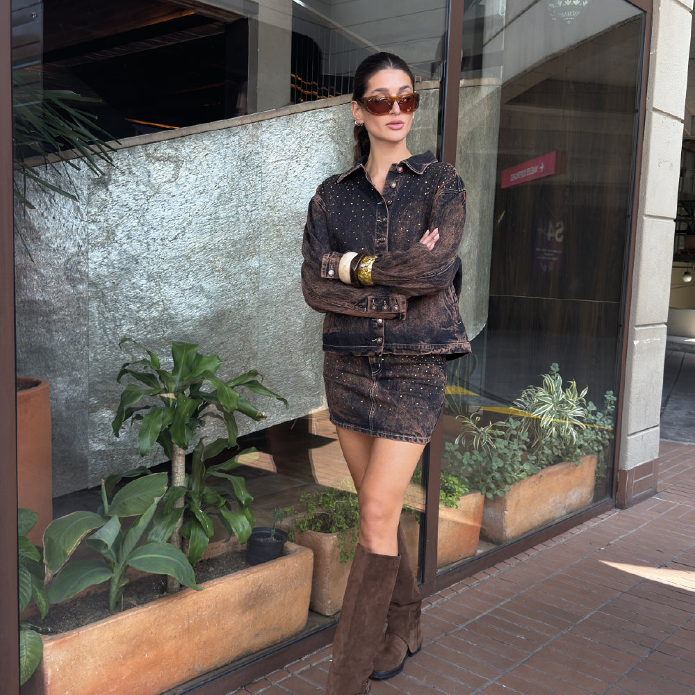 Set completo de chaqueta + falda en denim con brillantes en el frente y en la parte trasera. Falda tiro medio. Tela: 100% algodón. La modelo mide 1.73 m y está usando talla S en la chaqueta y talla 6 en la falda. (Te sugerimos que pidas una talla más grande en la falda de la que normalmente usas).