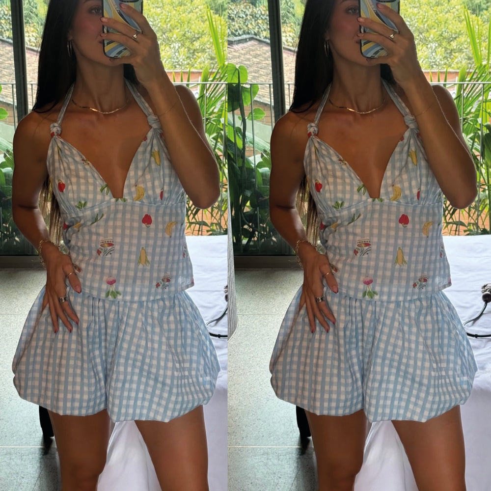 Set completo de top + falda. Tela 100% algodón. Falda con elástico en la pretina. Top halter estampado. Con cierre lateral. La modelo mide 1.73 m y está usando talla S.